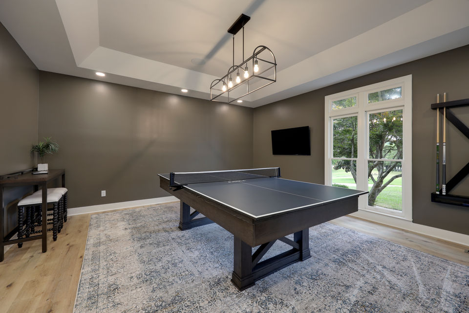 Multiple living areas provide various spaces for relaxation and entertainment. Sink into plush sofas in the cozy theater room, complete with Sonos surround sound and group seating, in the great room enjoy panoramic views of the surrounding countryside. Unwind in the elegant sitting room, perfect for quiet conversations or reading your favorite book. For those seeking a bit more excitement, the game room offers an array of activities, including billiards, ping pong, foosball, and a selection of board games.